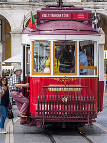 Senior tourist boarding a tram in Lisbon